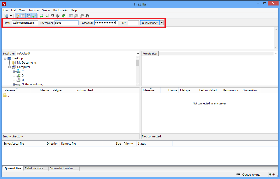 1) Load Filezilla, then fill in the 'quick connect' information as shown in the image to the left. Please use your domain name in the 'host' field and your hosting account username and passwords in there respective fields.