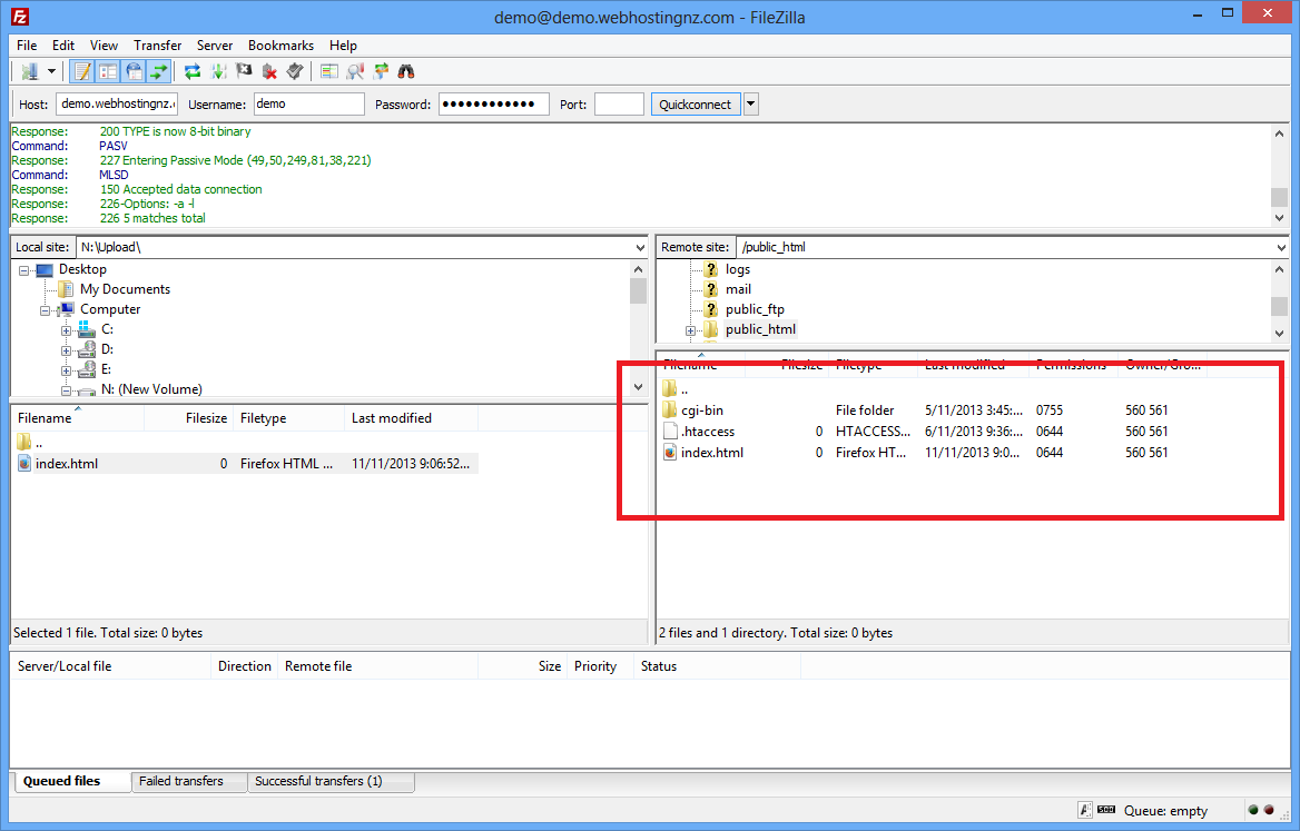 4) Once you have finished uploading your files/folders they will show in the right window just like our index.html file we have uploaded shown in the image to the left.