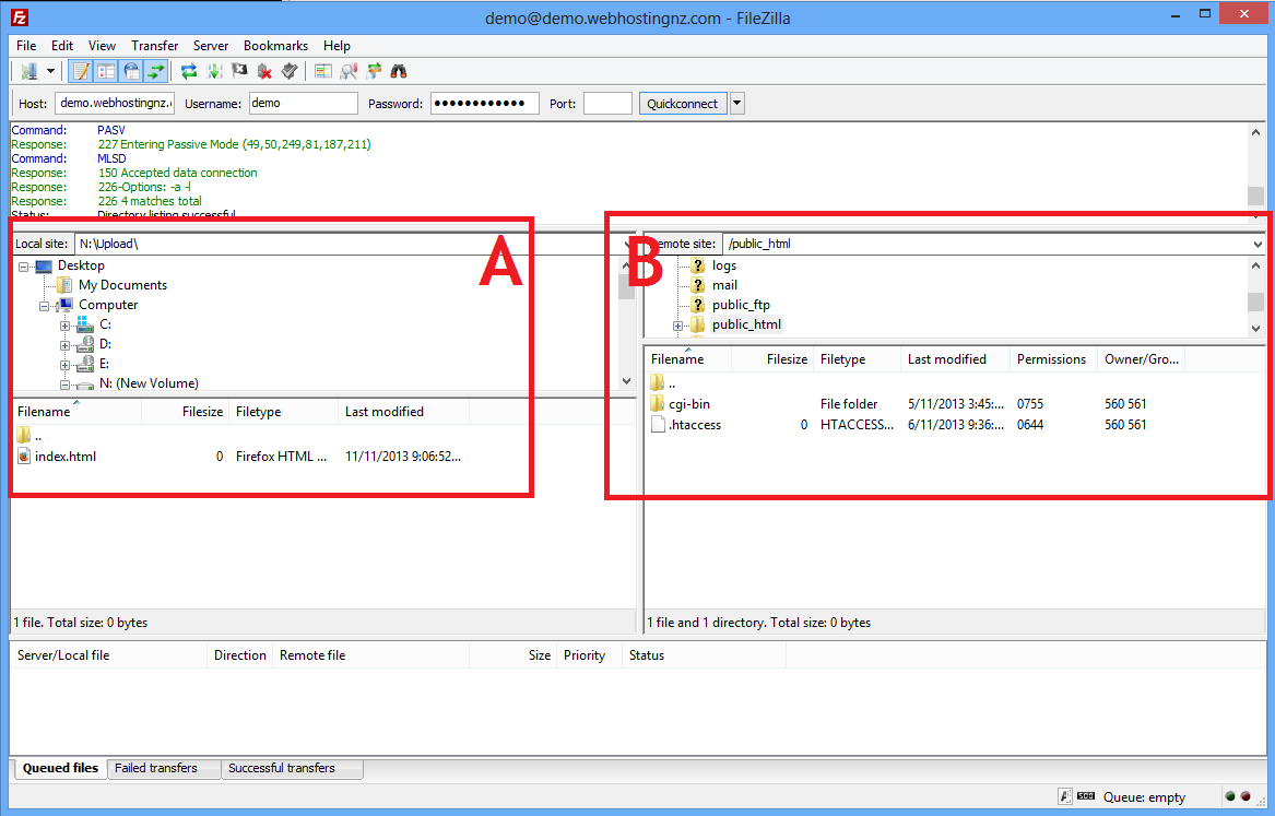3) In the left hand window (labled A in the left hand picture) browse to where you have the files you wish to upload saved. In the left hand picture B shows what the right hand window should look like this after completing step 2.